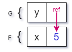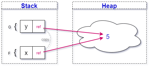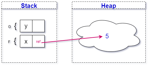 You can see that the variable x, although it still lives on the stack, is now just reference to an object on the heap. What happens when we pass this variable to the call of the second function G?