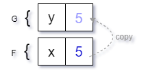 In order to pass the value 5 between our two methods F and G we need to somehow transfer this value to the new stack frame. The two choices we have are to either (a) copy the value from the old stack frame into a new stack frame: