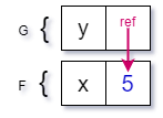 You can see that the variable x, although it still lives on the stack, is now just reference to an object on the heap. What happens when we pass this variable to the call of the second function G?