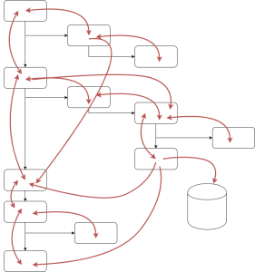 If we superimpose the flow of data through our system on top of this diagram, we can see that the two nicely map onto one another and the logic is easy to follow. This is because data can only flow up and down our ‘call stack’ through function arguments and return values: